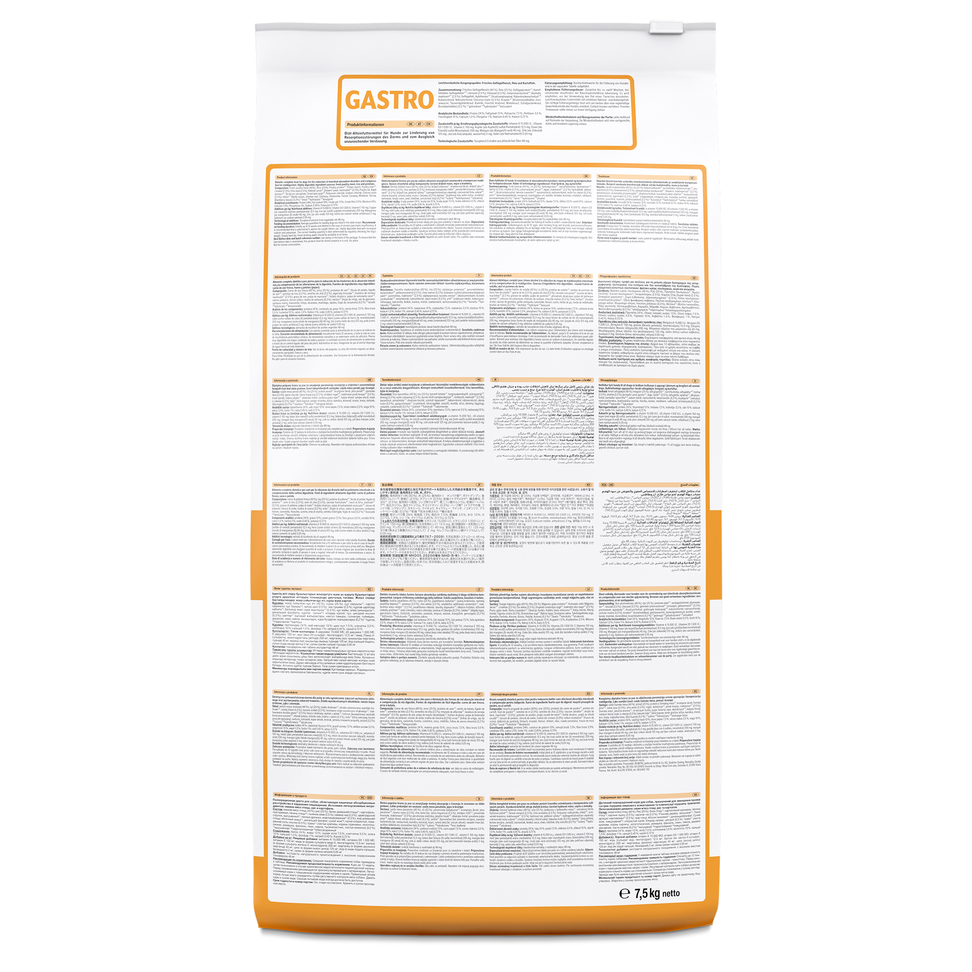 Samenstelling Vers pluimveevlees (40 %); rijst (25 %); pluimvee-eiwit*¹; aardappelzetmeel; pluimveelever*²; lijnzaad (2,5 %); chiazaad (2,5 %); gebroken johannesbrood*¹; brouwgist, geïnactiveerd*¹ (2,5 %); pluimveevet; appelpulp*¹; dicalciumfosfaat; gedroogde bietenpulp*³; kaliumchloride; natriumchloride; cichorei-inuline (0,3 %); kruiden*¹ (brandnetelblad, gentiaanwortel, duizendguldenkruid, kamille, venkel, karwij, maretak, duizendblad, braambladeren) (0,2 %) *¹gedroogd *²gehydrolyseerd *³ontsuikerd